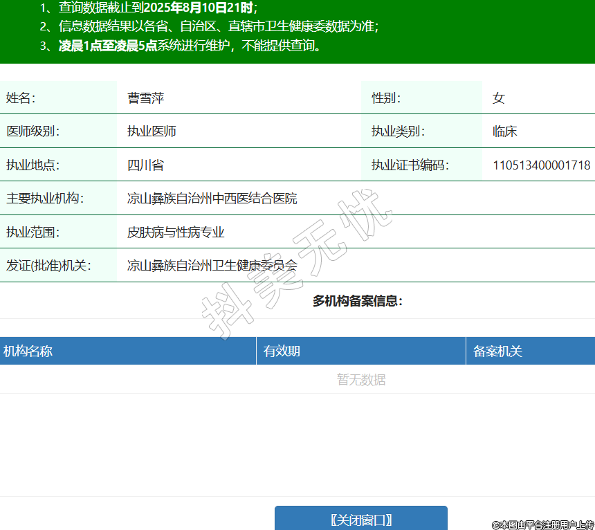 姓名:曹雪萍性別:女醫(yī)師級(jí)別:執(zhí)業(yè)醫(yī)師執(zhí)業(yè)類別:臨床執(zhí)業(yè)地點(diǎn):四川省執(zhí)業(yè)證書編碼:110513400001718主要執(zhí)業(yè)機(jī)構(gòu):涼山彝族自治州中西醫(yī)結(jié)合醫(yī)院執(zhí)業(yè)范圍:皮膚病與性病專業(yè)發(fā)證(批準(zhǔn))機(jī)關(guān):涼山彝族自治州衛(wèi)生健康委員會(huì) -