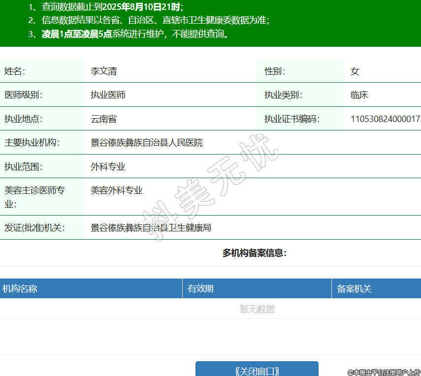 姓名:李文清性別:女醫(yī)師級別:執(zhí)業(yè)醫(yī)師執(zhí)業(yè)類別:臨床執(zhí)業(yè)地點(diǎn):云南省執(zhí)業(yè)證書編碼:110530824000017主要執(zhí)業(yè)機(jī)構(gòu):景谷傣族彝族自治縣人民醫(yī)院執(zhí)業(yè)范圍:外科專業(yè)美容主診醫(yī)師專業(yè):美容外科專業(yè)發(fā)證(批準(zhǔn))機(jī)關(guān):景谷傣族彝族自治縣衛(wèi)生健康局 -