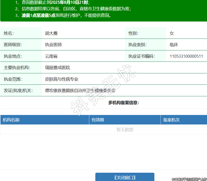 姓名:胡大雁性別:女醫(yī)師級(jí)別:執(zhí)業(yè)醫(yī)師執(zhí)業(yè)類別:臨床執(zhí)業(yè)地點(diǎn):云南省執(zhí)業(yè)證書編碼:110533100000511主要執(zhí)業(yè)機(jī)構(gòu):瑞麗景成醫(yī)院執(zhí)業(yè)范圍:皮膚病與性病專業(yè)發(fā)證(批準(zhǔn))機(jī)關(guān):德宏傣族景頗族自治州衛(wèi)生健康委員會(huì) -