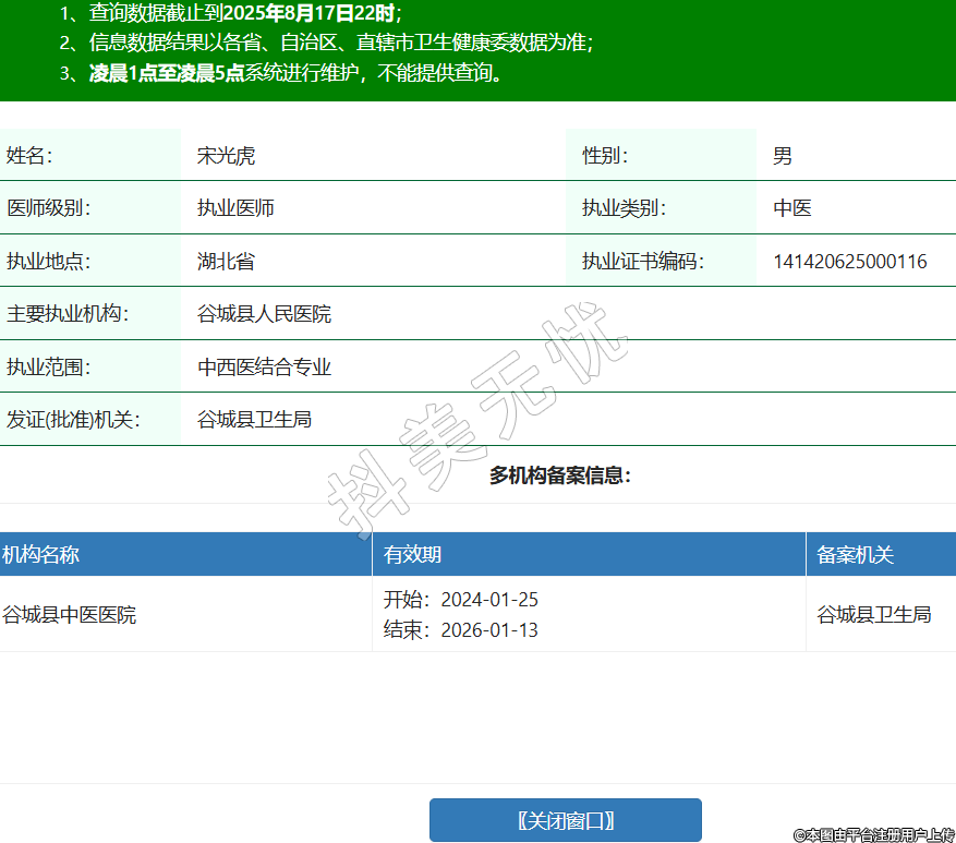 姓名:宋光虎性別:男醫(yī)師級別:執(zhí)業(yè)醫(yī)師執(zhí)業(yè)類別:中醫(yī)執(zhí)業(yè)地點:湖北省執(zhí)業(yè)證書編碼:141420625000116主要執(zhí)業(yè)機構(gòu):谷城縣人民醫(yī)院執(zhí)業(yè)范圍:中西醫(yī)結(jié)合專業(yè)發(fā)證(批準)機關(guān):谷城縣衛(wèi)生局多機構(gòu)備案信息:機構(gòu)名稱 有效期 備案機關(guān) 谷城縣中醫(yī)醫(yī)院 開始:2024-01-25結(jié)束:2026-01-13谷城縣衛(wèi)生局 -