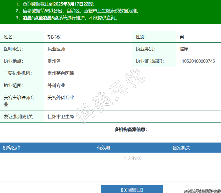 姓名:胡興權性別:男醫(yī)師級別:執(zhí)業(yè)醫(yī)師執(zhí)業(yè)類別:臨床執(zhí)業(yè)地點:貴州省執(zhí)業(yè)證書編碼:110520400000745主要執(zhí)業(yè)機構:貴州茅臺醫(yī)院執(zhí)業(yè)范圍:外科專業(yè)美容主診醫(yī)師專業(yè):美容外科專業(yè)發(fā)證(批準)機關:仁懷市衛(wèi)生局 -