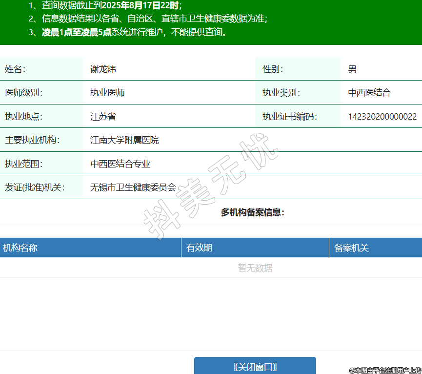 姓名:謝龍煒性別:男醫(yī)師級別:執(zhí)業(yè)醫(yī)師執(zhí)業(yè)類別:中西醫(yī)結(jié)合執(zhí)業(yè)地點:江蘇省執(zhí)業(yè)證書編碼:142320200000022主要執(zhí)業(yè)機(jī)構(gòu):江南大學(xué)附屬醫(yī)院執(zhí)業(yè)范圍:中西醫(yī)結(jié)合專業(yè)發(fā)證(批準(zhǔn))機(jī)關(guān):無錫市衛(wèi)生健康委員會 -