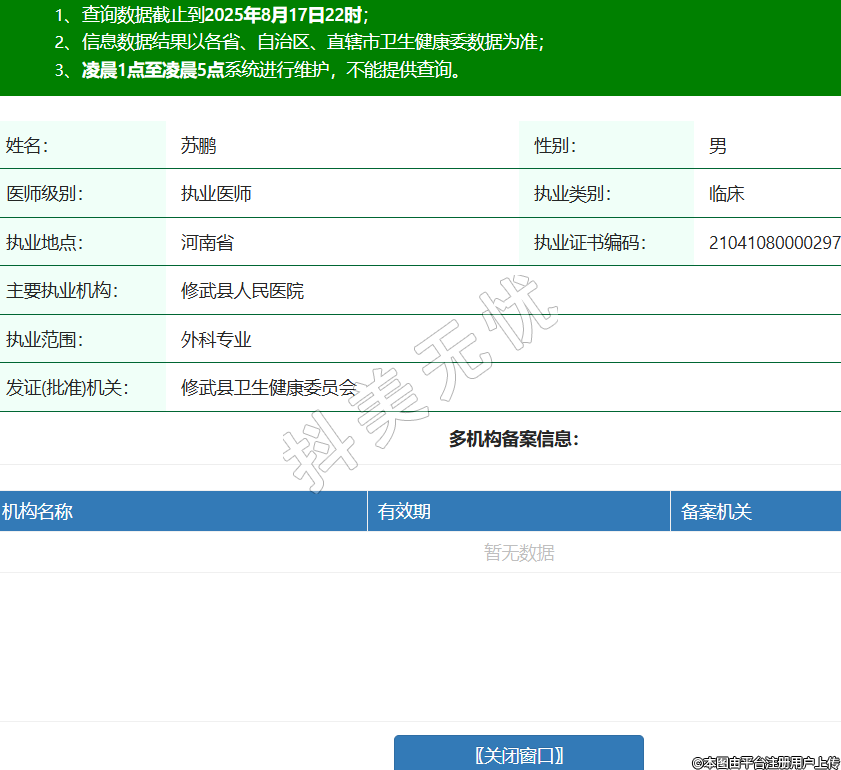 姓名:蘇鵬性別:男醫(yī)師級別:執(zhí)業(yè)醫(yī)師執(zhí)業(yè)類別:臨床執(zhí)業(yè)地點:河南省執(zhí)業(yè)證書編碼:210410800002972主要執(zhí)業(yè)機構:修武縣人民醫(yī)院執(zhí)業(yè)范圍:外科專業(yè)發(fā)證(批準)機關:修武縣衛(wèi)生健康委員會 -