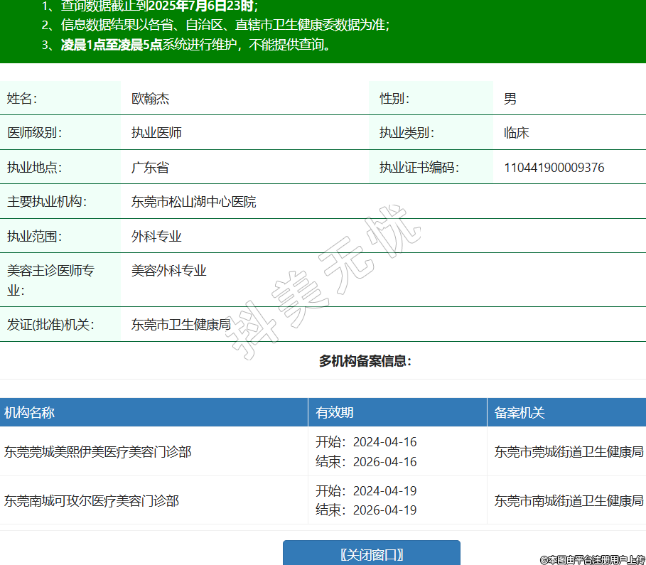 姓名:歐翰杰性別:男醫(yī)師級別:執(zhí)業(yè)醫(yī)師執(zhí)業(yè)類別:臨床執(zhí)業(yè)地點:廣東省執(zhí)業(yè)證書編碼:110441900009376主要執(zhí)業(yè)機構:東莞市松山湖中心醫(yī)院執(zhí)業(yè)范圍:外科專業(yè)美容主診醫(yī)師專業(yè):美容外科專業(yè)發(fā)證(批準)機關:東莞市衛(wèi)生健康局多機構備案信息:機構名稱 有效期 備案機關 東莞莞城美熙伊美醫(yī)療美容門診部 開始:2024-04-16結束:2026-04-16東莞市莞城街道衛(wèi)生健康局 東莞南城可玫爾醫(yī)療美容門診部 開始:2024-04-19結束:2026-04-19東莞市南城街道衛(wèi)生健康局 -