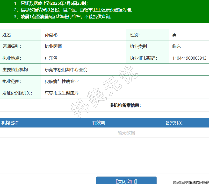 姓名:孫澍彬性別:男醫(yī)師級(jí)別:執(zhí)業(yè)醫(yī)師執(zhí)業(yè)類別:臨床執(zhí)業(yè)地點(diǎn):廣東省執(zhí)業(yè)證書編碼:110441900003913主要執(zhí)業(yè)機(jī)構(gòu):東莞市松山湖中心醫(yī)院執(zhí)業(yè)范圍:皮膚病與性病專業(yè)發(fā)證(批準(zhǔn))機(jī)關(guān):東莞市衛(wèi)生健康局 -