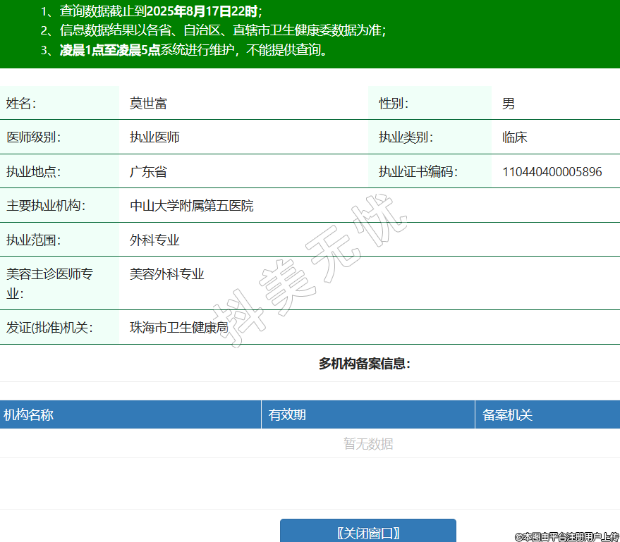 姓名:莫世富性別:男醫(yī)師級(jí)別:執(zhí)業(yè)醫(yī)師執(zhí)業(yè)類(lèi)別:臨床執(zhí)業(yè)地點(diǎn):廣東省執(zhí)業(yè)證書(shū)編碼:110440400005896主要執(zhí)業(yè)機(jī)構(gòu):中山大學(xué)附屬第五醫(yī)院執(zhí)業(yè)范圍:外科專(zhuān)業(yè)美容主診醫(yī)師專(zhuān)業(yè):美容外科專(zhuān)業(yè)發(fā)證(批準(zhǔn))機(jī)關(guān):珠海市衛(wèi)生健康局 -