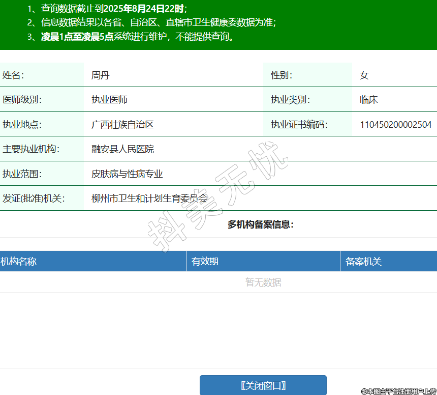 姓名:周丹性別:女醫(yī)師級別:執(zhí)業(yè)醫(yī)師執(zhí)業(yè)類別:臨床執(zhí)業(yè)地點:廣西壯族自治區(qū)執(zhí)業(yè)證書編碼:110450200002504主要執(zhí)業(yè)機構:融安縣人民醫(yī)院執(zhí)業(yè)范圍:皮膚病與性病專業(yè)發(fā)證(批準)機關:柳州市衛(wèi)生和計劃生育委員會 -