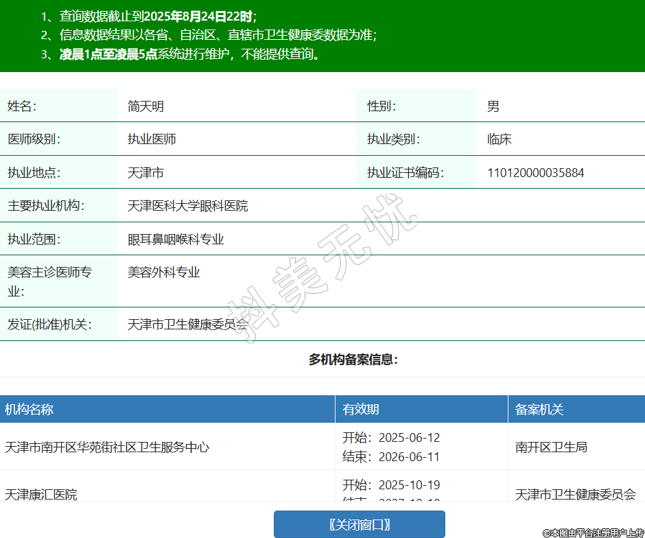 姓名:簡(jiǎn)天明性別:男醫(yī)師級(jí)別:執(zhí)業(yè)醫(yī)師執(zhí)業(yè)類別:臨床執(zhí)業(yè)地點(diǎn):天津市執(zhí)業(yè)證書編碼:110120000035884主要執(zhí)業(yè)機(jī)構(gòu):天津醫(yī)科大學(xué)眼科醫(yī)院執(zhí)業(yè)范圍:眼耳鼻咽喉科專業(yè)美容主診醫(yī)師專業(yè):美容外科專業(yè)發(fā)證(批準(zhǔn))機(jī)關(guān):天津市衛(wèi)生健康委員會(huì)多機(jī)構(gòu)備案信息:機(jī)構(gòu)名稱 有效期 備案機(jī)關(guān) 天津市南開區(qū)華苑街社區(qū)衛(wèi)生服務(wù)中心 開始:2025-06-12結(jié)束:2026-06-11南開區(qū)衛(wèi)生局 天津康匯醫(yī)院 開始:2025-10-19結(jié)束:2027-10-18天津市衛(wèi)生健康委員會(huì) -