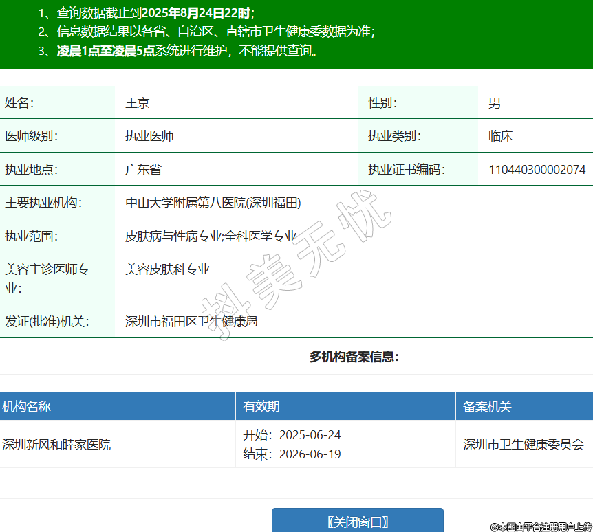 姓名:王京性別:男醫(yī)師級(jí)別:執(zhí)業(yè)醫(yī)師執(zhí)業(yè)類(lèi)別:臨床執(zhí)業(yè)地點(diǎn):廣東省執(zhí)業(yè)證書(shū)編碼:110440300002074主要執(zhí)業(yè)機(jī)構(gòu):中山大學(xué)附屬第八醫(yī)院(深圳福田)執(zhí)業(yè)范圍:皮膚病與性病專業(yè);全科醫(yī)學(xué)專業(yè)美容主診醫(yī)師專業(yè):美容皮膚科專業(yè)發(fā)證(批準(zhǔn))機(jī)關(guān):深圳市福田區(qū)衛(wèi)生健康局多機(jī)構(gòu)備案信息:機(jī)構(gòu)名稱 有效期 備案機(jī)關(guān) 深圳新風(fēng)和睦家醫(yī)院 開(kāi)始:2025-06-24結(jié)束:2026-06-19深圳市衛(wèi)生健康委員會(huì) -