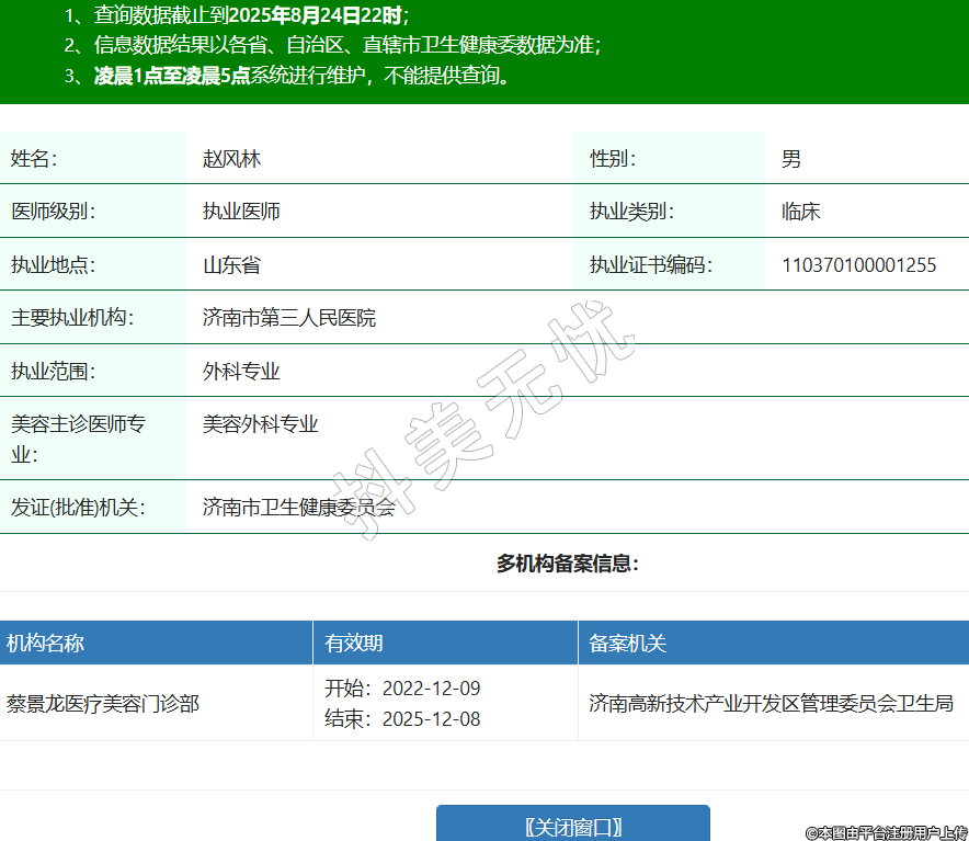 姓名:趙風(fēng)林性別:男醫(yī)師級別:執(zhí)業(yè)醫(yī)師執(zhí)業(yè)類別:臨床執(zhí)業(yè)地點:山東省執(zhí)業(yè)證書編碼:110370100001255主要執(zhí)業(yè)機(jī)構(gòu):濟(jì)南市第三人民醫(yī)院執(zhí)業(yè)范圍:外科專業(yè)美容主診醫(yī)師專業(yè):美容外科專業(yè)發(fā)證(批準(zhǔn))機(jī)關(guān):濟(jì)南市衛(wèi)生健康委員會多機(jī)構(gòu)備案信息:機(jī)構(gòu)名稱 有效期 備案機(jī)關(guān) 蔡景龍醫(yī)療美容門診部 開始:2022-12-09結(jié)束:2025-12-08濟(jì)南高新技術(shù)產(chǎn)業(yè)開發(fā)區(qū)管理委員會衛(wèi)生局 -