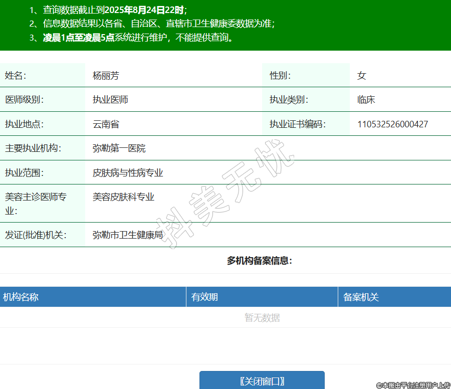 姓名:楊麗芳性別:女醫(yī)師級別:執(zhí)業(yè)醫(yī)師執(zhí)業(yè)類別:臨床執(zhí)業(yè)地點:云南省執(zhí)業(yè)證書編碼:110532526000427主要執(zhí)業(yè)機構(gòu):彌勒第一醫(yī)院執(zhí)業(yè)范圍:皮膚病與性病專業(yè)美容主診醫(yī)師專業(yè):美容皮膚科專業(yè)發(fā)證(批準)機關:彌勒市衛(wèi)生健康局 -