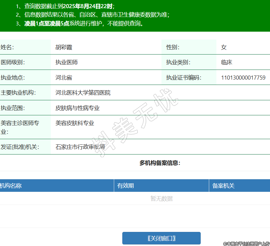 姓名:胡彩霞性別:女醫(yī)師級(jí)別:執(zhí)業(yè)醫(yī)師執(zhí)業(yè)類(lèi)別:臨床執(zhí)業(yè)地點(diǎn):河北省執(zhí)業(yè)證書(shū)編碼:110130000017759主要執(zhí)業(yè)機(jī)構(gòu):河北醫(yī)科大學(xué)第四醫(yī)院執(zhí)業(yè)范圍:皮膚病與性病專(zhuān)業(yè)美容主診醫(yī)師專(zhuān)業(yè):美容皮膚科專(zhuān)業(yè)發(fā)證(批準(zhǔn))機(jī)關(guān):石家莊市行政審批局 -