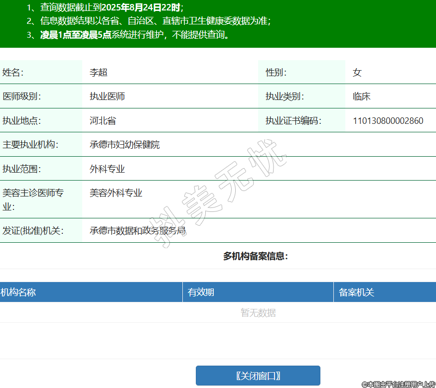 姓名:李超性別:女醫(yī)師級別:執(zhí)業(yè)醫(yī)師執(zhí)業(yè)類別:臨床執(zhí)業(yè)地點:河北省執(zhí)業(yè)證書編碼:110130800002860主要執(zhí)業(yè)機構:承德市婦幼保健院執(zhí)業(yè)范圍:外科專業(yè)美容主診醫(yī)師專業(yè):美容外科專業(yè)發(fā)證(批準)機關:承德市數據和政務服務局 -