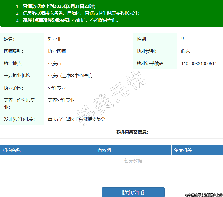 姓名:劉亞非性別:男醫(yī)師級(jí)別:執(zhí)業(yè)醫(yī)師執(zhí)業(yè)類別:臨床執(zhí)業(yè)地點(diǎn):重慶市執(zhí)業(yè)證書編碼:110500381000614主要執(zhí)業(yè)機(jī)構(gòu):重慶市江津區(qū)中心醫(yī)院執(zhí)業(yè)范圍:外科專業(yè)美容主診醫(yī)師專業(yè):美容外科專業(yè)發(fā)證(批準(zhǔn))機(jī)關(guān):重慶市江津區(qū)衛(wèi)生健康委員會(huì) -