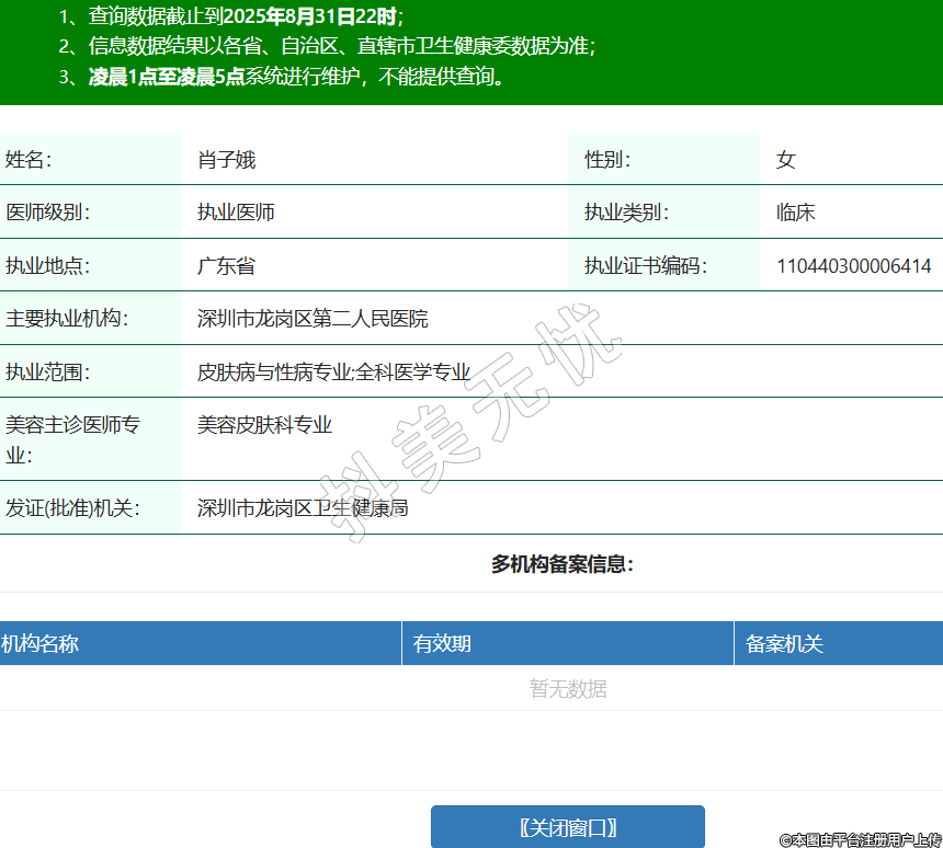 姓名:肖子娥性別:女醫(yī)師級別:執(zhí)業(yè)醫(yī)師執(zhí)業(yè)類別:臨床執(zhí)業(yè)地點:廣東省執(zhí)業(yè)證書編碼:110440300006414主要執(zhí)業(yè)機構:深圳市龍崗區(qū)第二人民醫(yī)院執(zhí)業(yè)范圍:皮膚病與性病專業(yè);全科醫(yī)學專業(yè)美容主診醫(yī)師專業(yè):美容皮膚科專業(yè)發(fā)證(批準)機關:深圳市龍崗區(qū)衛(wèi)生健康局 -