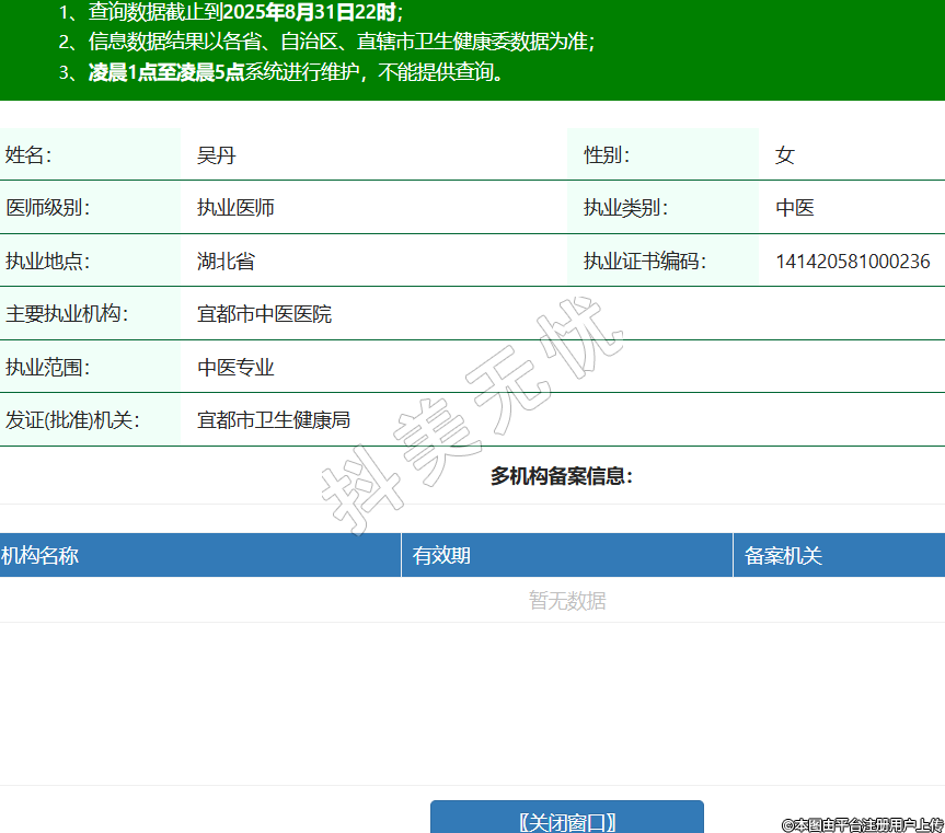 姓名:吳丹性別:女醫(yī)師級別:執(zhí)業(yè)醫(yī)師執(zhí)業(yè)類別:中醫(yī)執(zhí)業(yè)地點(diǎn):湖北省執(zhí)業(yè)證書編碼:141420581000236主要執(zhí)業(yè)機(jī)構(gòu):宜都市中醫(yī)醫(yī)院執(zhí)業(yè)范圍:中醫(yī)專業(yè)發(fā)證(批準(zhǔn))機(jī)關(guān):宜都市衛(wèi)生健康局 -