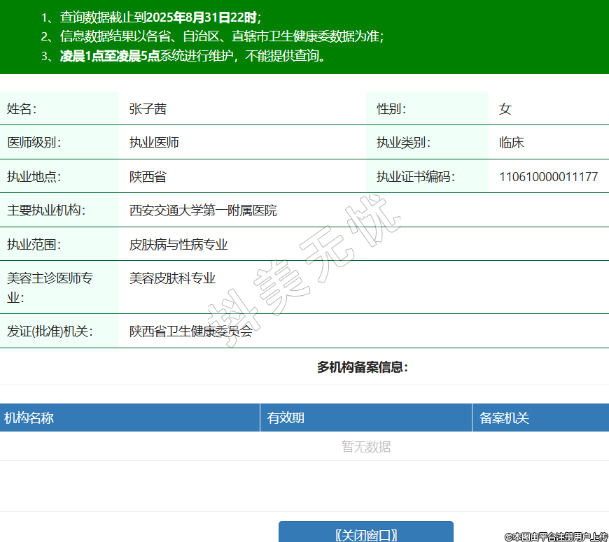 姓名:張子茜性別:女醫(yī)師級別:執(zhí)業(yè)醫(yī)師執(zhí)業(yè)類別:臨床執(zhí)業(yè)地點(diǎn):陜西省執(zhí)業(yè)證書編碼:110610000011177主要執(zhí)業(yè)機(jī)構(gòu):西安交通大學(xué)第一附屬醫(yī)院執(zhí)業(yè)范圍:皮膚病與性病專業(yè)美容主診醫(yī)師專業(yè):美容皮膚科專業(yè)發(fā)證(批準(zhǔn))機(jī)關(guān):陜西省衛(wèi)生健康委員會 -