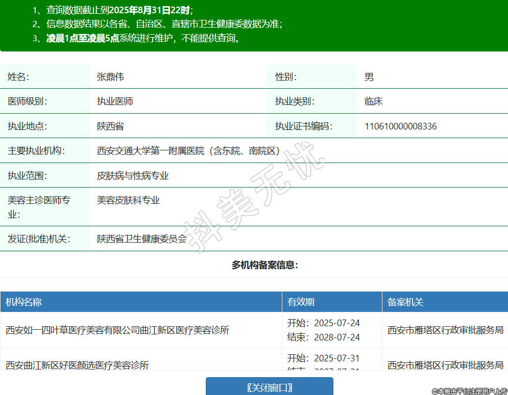 姓名:張鼎偉性別:男醫(yī)師級別:執(zhí)業(yè)醫(yī)師執(zhí)業(yè)類別:臨床執(zhí)業(yè)地點:陜西省執(zhí)業(yè)證書編碼:110610000008336主要執(zhí)業(yè)機構(gòu):西安交通大學(xué)第一附屬醫(yī)院(含東院、南院區(qū))執(zhí)業(yè)范圍:皮膚病與性病專業(yè)美容主診醫(yī)師專業(yè):美容皮膚科專業(yè)發(fā)證(批準(zhǔn))機關(guān):陜西省衛(wèi)生健康委員會多機構(gòu)備案信息:機構(gòu)名稱 有效期 備案機關(guān) 西安如一四葉草醫(yī)療美容有限公司曲江新區(qū)醫(yī)療美容診所 開始:2025-07-24結(jié)束:2028-07-24西安市雁塔區(qū)行政審批服務(wù)局 西安曲江新區(qū)好醫(yī)顏選醫(yī)療美容診所 開始:2025-07-31結(jié)束:2027-07-31西安市雁塔區(qū)行政審批服務(wù)局 -