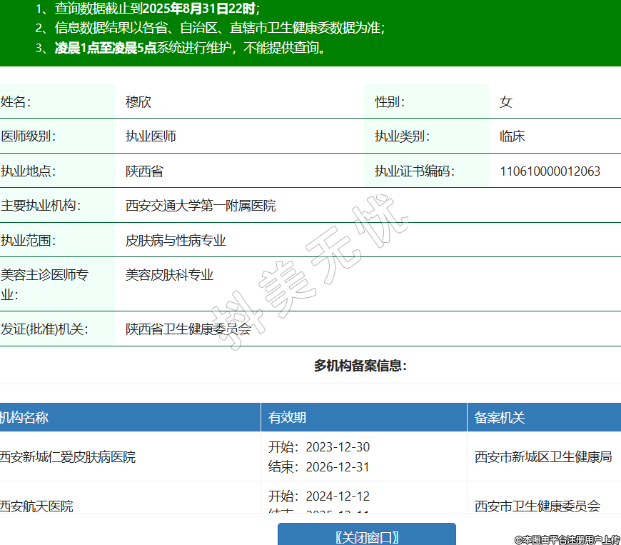 姓名:穆欣性別:女醫(yī)師級別:執(zhí)業(yè)醫(yī)師執(zhí)業(yè)類別:臨床執(zhí)業(yè)地點:陜西省執(zhí)業(yè)證書編碼:110610000012063主要執(zhí)業(yè)機構:西安交通大學第一附屬醫(yī)院執(zhí)業(yè)范圍:皮膚病與性病專業(yè)美容主診醫(yī)師專業(yè):美容皮膚科專業(yè)發(fā)證(批準)機關:陜西省衛(wèi)生健康委員會多機構備案信息:機構名稱 有效期 備案機關 西安新城仁愛皮膚病醫(yī)院 開始:2023-12-30結束:2026-12-31西安市新城區(qū)衛(wèi)生健康局 西安航天醫(yī)院 開始:2024-12-12結束:2025-12-11西安市衛(wèi)生健康委員會 渭南市中心醫(yī)院 開始:2024-12-26結束:2026-12-25渭南市衛(wèi)生健康委員會 -