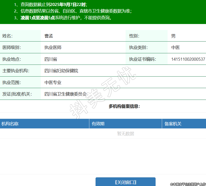 姓名:曹孟性別:男醫(yī)師級(jí)別:執(zhí)業(yè)醫(yī)師執(zhí)業(yè)類(lèi)別:中醫(yī)執(zhí)業(yè)地點(diǎn):四川省執(zhí)業(yè)證書(shū)編碼:141511002000537主要執(zhí)業(yè)機(jī)構(gòu):四川省婦幼保健院執(zhí)業(yè)范圍:中醫(yī)專(zhuān)業(yè)發(fā)證(批準(zhǔn))機(jī)關(guān):四川省衛(wèi)生健康委員會(huì) -