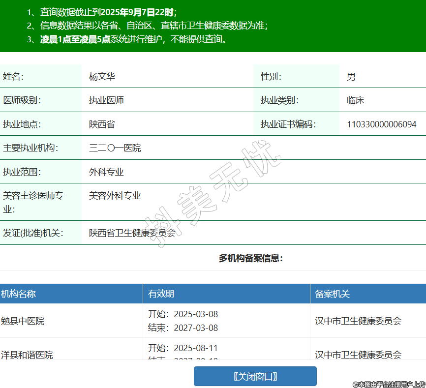 姓名:楊文華性別:男醫(yī)師級(jí)別:執(zhí)業(yè)醫(yī)師執(zhí)業(yè)類別:臨床執(zhí)業(yè)地點(diǎn):陜西省執(zhí)業(yè)證書(shū)編碼:110330000006094主要執(zhí)業(yè)機(jī)構(gòu):三二〇一醫(yī)院執(zhí)業(yè)范圍:外科專業(yè)美容主診醫(yī)師專業(yè):美容外科專業(yè)發(fā)證(批準(zhǔn))機(jī)關(guān):陜西省衛(wèi)生健康委員會(huì)多機(jī)構(gòu)備案信息:機(jī)構(gòu)名稱 有效期 備案機(jī)關(guān) 勉縣中醫(yī)院 開(kāi)始:2025-03-08結(jié)束:2027-03-08漢中市衛(wèi)生健康委員會(huì) 洋縣和諧醫(yī)院 開(kāi)始:2025-08-11結(jié)束:2027-08-10漢中市衛(wèi)生健康委員會(huì) 勉縣婦幼保健院 開(kāi)始:2025-08-23結(jié)束:2027-08-22漢中市衛(wèi)生健康委員會(huì) -