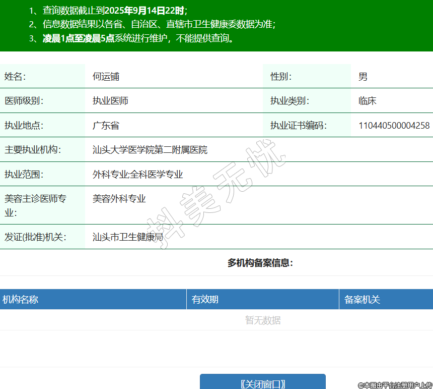 姓名:何運(yùn)鋪性別:男醫(yī)師級別:執(zhí)業(yè)醫(yī)師執(zhí)業(yè)類別:臨床執(zhí)業(yè)地點(diǎn):廣東省執(zhí)業(yè)證書編碼:110440500004258主要執(zhí)業(yè)機(jī)構(gòu):汕頭大學(xué)醫(yī)學(xué)院第二附屬醫(yī)院執(zhí)業(yè)范圍:外科專業(yè);全科醫(yī)學(xué)專業(yè)美容主診醫(yī)師專業(yè):美容外科專業(yè)發(fā)證(批準(zhǔn))機(jī)關(guān):汕頭市衛(wèi)生健康局 -