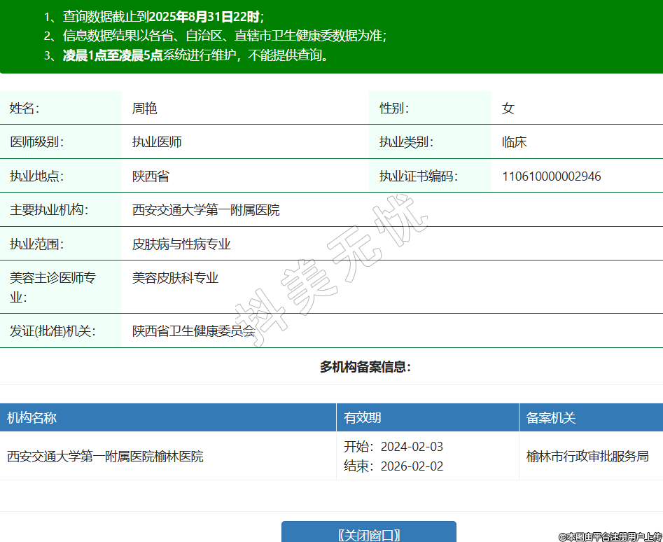姓名:周艷性別:女醫(yī)師級別:執(zhí)業(yè)醫(yī)師執(zhí)業(yè)類別:臨床執(zhí)業(yè)地點:陜西省執(zhí)業(yè)證書編碼:110610000002946主要執(zhí)業(yè)機構(gòu):西安交通大學(xué)第一附屬醫(yī)院執(zhí)業(yè)范圍:皮膚病與性病專業(yè)美容主診醫(yī)師專業(yè):美容皮膚科專業(yè)發(fā)證(批準)機關(guān):陜西省衛(wèi)生健康委員會多機構(gòu)備案信息:機構(gòu)名稱 有效期 備案機關(guān) 西安交通大學(xué)第一附屬醫(yī)院榆林醫(yī)院 開始:2024-02-03結(jié)束:2026-02-02榆林市行政審批服務(wù)局 -