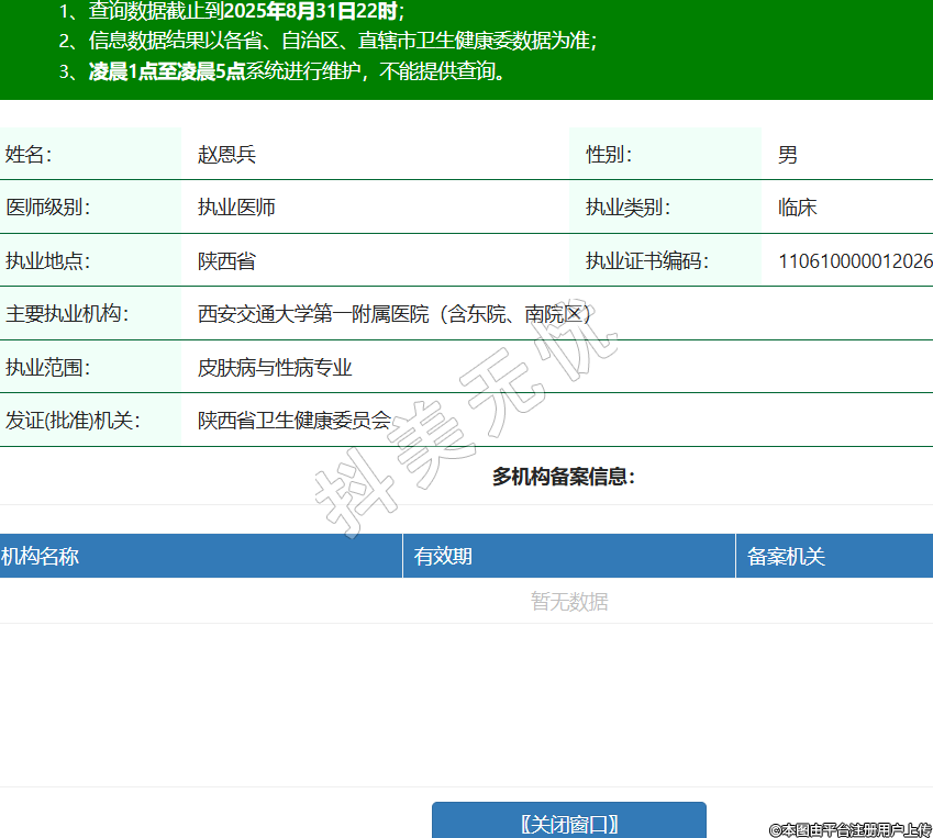 姓名:趙恩兵性別:男醫(yī)師級別:執(zhí)業(yè)醫(yī)師執(zhí)業(yè)類別:臨床執(zhí)業(yè)地點:陜西省執(zhí)業(yè)證書編碼:110610000012026主要執(zhí)業(yè)機構(gòu):西安交通大學第一附屬醫(yī)院(含東院、南院區(qū))執(zhí)業(yè)范圍:皮膚病與性病專業(yè)發(fā)證(批準)機關(guān):陜西省衛(wèi)生健康委員會 -