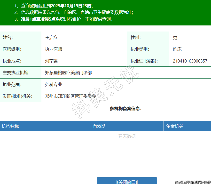 姓名:王啟立性別:男醫(yī)師級別:執(zhí)業(yè)醫(yī)師執(zhí)業(yè)類別:臨床執(zhí)業(yè)地點:河南省執(zhí)業(yè)證書編碼:210410103000357主要執(zhí)業(yè)機構(gòu):鄭東星格醫(yī)療美容門診部執(zhí)業(yè)范圍:外科專業(yè)發(fā)證(批準(zhǔn))機關(guān):鄭州市鄭東新區(qū)管理委員會 -