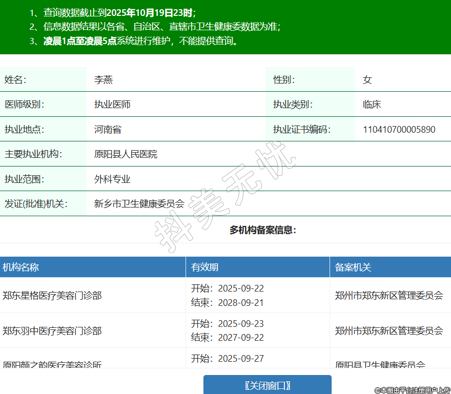姓名:李燕性別:女醫(yī)師級別:執(zhí)業(yè)醫(yī)師執(zhí)業(yè)類別:臨床執(zhí)業(yè)地點:河南省執(zhí)業(yè)證書編碼:110410700005890主要執(zhí)業(yè)機構:原陽縣人民醫(yī)院執(zhí)業(yè)范圍:外科專業(yè)發(fā)證(批準)機關:新鄉(xiāng)市衛(wèi)生健康委員會多機構備案信息:機構名稱 有效期 備案機關 鄭東星格醫(yī)療美容門診部 開始:2025-09-22結束:2028-09-21鄭州市鄭東新區(qū)管理委員會 鄭東羽中醫(yī)療美容門診部 開始:2025-09-23結束:2027-09-22鄭州市鄭東新區(qū)管理委員會 原陽顏之韻醫(yī)療美容診所 開始:2025-09-27結束:2027-09-26原陽縣衛(wèi)生健康委員會 -