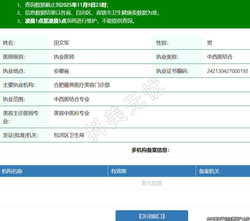 姓名:田文軍性別:男醫(yī)師級(jí)別:執(zhí)業(yè)醫(yī)師執(zhí)業(yè)類別:中西醫(yī)結(jié)合執(zhí)業(yè)地點(diǎn):安徽省執(zhí)業(yè)證書編碼:242130427000192主要執(zhí)業(yè)機(jī)構(gòu):合肥蕥典醫(yī)療美容門診部執(zhí)業(yè)范圍:中西醫(yī)結(jié)合專業(yè)美容主診醫(yī)師專業(yè):美容中醫(yī)科專業(yè)發(fā)證(批準(zhǔn))機(jī)關(guān):包河區(qū)衛(wèi)生局 -