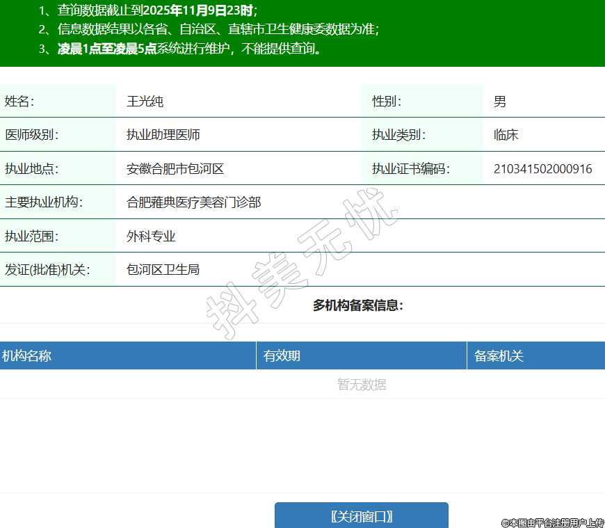 姓名:王光純性別:男醫(yī)師級別:執(zhí)業(yè)助理醫(yī)師執(zhí)業(yè)類別:臨床執(zhí)業(yè)地點:安徽合肥市包河區(qū)執(zhí)業(yè)證書編碼:210341502000916主要執(zhí)業(yè)機構:合肥蕥典醫(yī)療美容門診部執(zhí)業(yè)范圍:外科專業(yè)發(fā)證(批準)機關:包河區(qū)衛(wèi)生局 -