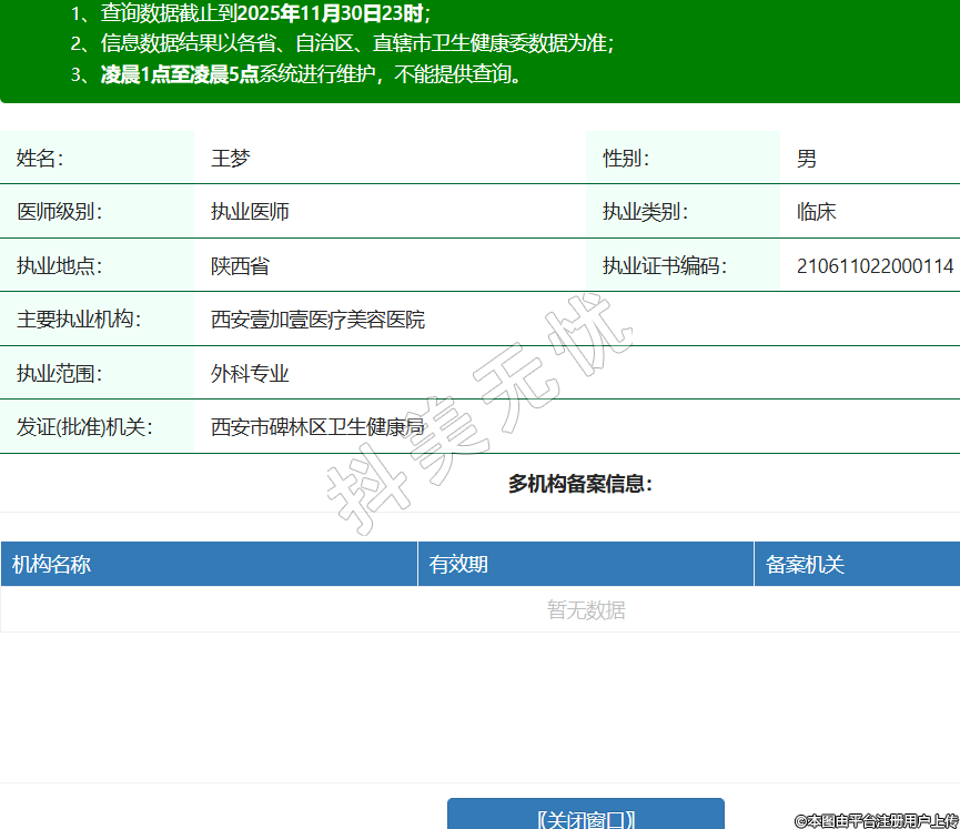 姓名:王夢性別:男醫(yī)師級別:執(zhí)業(yè)醫(yī)師執(zhí)業(yè)類別:臨床執(zhí)業(yè)地點:陜西省執(zhí)業(yè)證書編碼:210611022000114主要執(zhí)業(yè)機(jī)構(gòu):西安壹加壹醫(yī)療美容醫(yī)院執(zhí)業(yè)范圍:外科專業(yè)發(fā)證(批準(zhǔn))機(jī)關(guān):西安市碑林區(qū)衛(wèi)生健康局 -