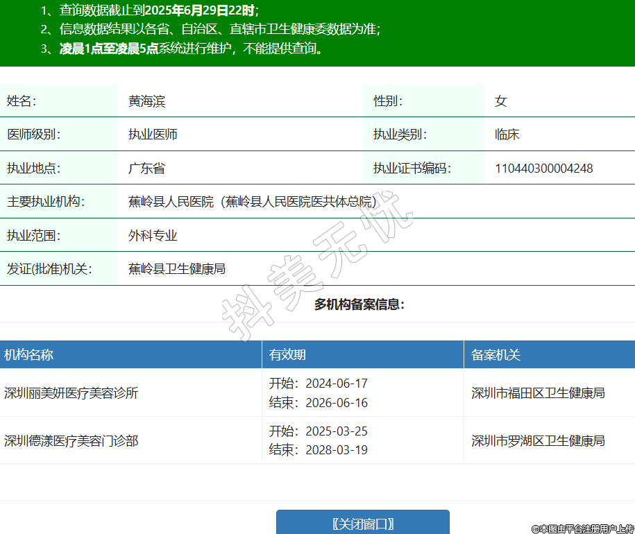 姓名:黃海濱性別:女醫(yī)師級(jí)別:執(zhí)業(yè)醫(yī)師執(zhí)業(yè)類別:臨床執(zhí)業(yè)地點(diǎn):廣東省執(zhí)業(yè)證書編碼:110440300004248主要執(zhí)業(yè)機(jī)構(gòu):蕉嶺縣人民醫(yī)院(蕉嶺縣人民醫(yī)院醫(yī)共體總院)執(zhí)業(yè)范圍:外科專業(yè)發(fā)證(批準(zhǔn))機(jī)關(guān):蕉嶺縣衛(wèi)生健康局多機(jī)構(gòu)備案信息:機(jī)構(gòu)名稱 有效期 備案機(jī)關(guān) 深圳麗美妍醫(yī)療美容診所 開始:2024-06-17結(jié)束:2026-06-16深圳市福田區(qū)衛(wèi)生健康局 深圳德漾醫(yī)療美容門診部 開始:2025-03-25結(jié)束:2028-03-19深圳市羅湖區(qū)衛(wèi)生健康局 -
