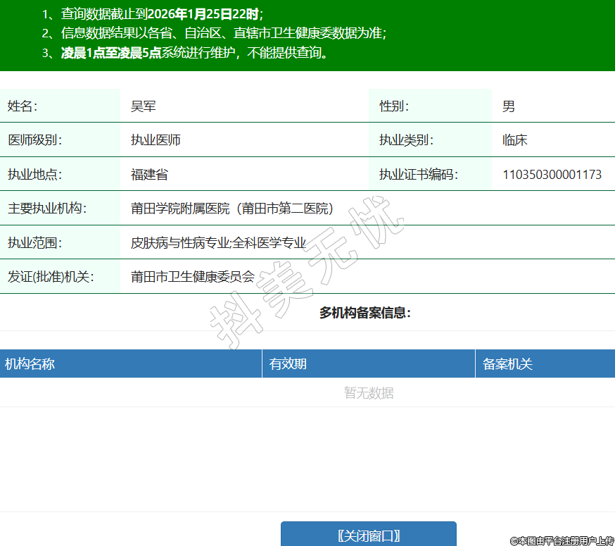 姓名:吳軍性別:男醫(yī)師級(jí)別:執(zhí)業(yè)醫(yī)師執(zhí)業(yè)類別:臨床執(zhí)業(yè)地點(diǎn):福建省執(zhí)業(yè)證書編碼:110350300001173主要執(zhí)業(yè)機(jī)構(gòu):莆田學(xué)院附屬醫(yī)院(莆田市第二醫(yī)院)執(zhí)業(yè)范圍:皮膚病與性病專業(yè);全科醫(yī)學(xué)專業(yè)發(fā)證(批準(zhǔn))機(jī)關(guān):莆田市衛(wèi)生健康委員會(huì) -