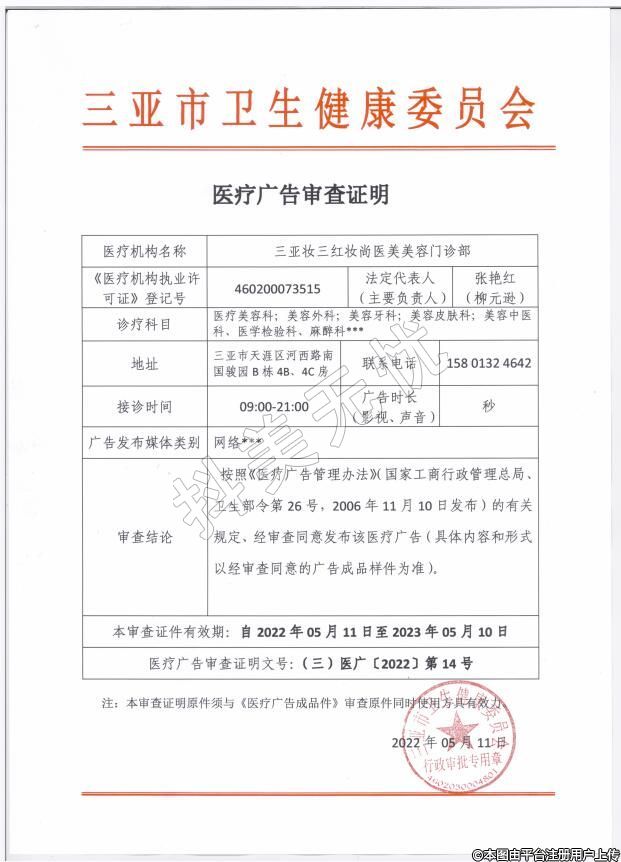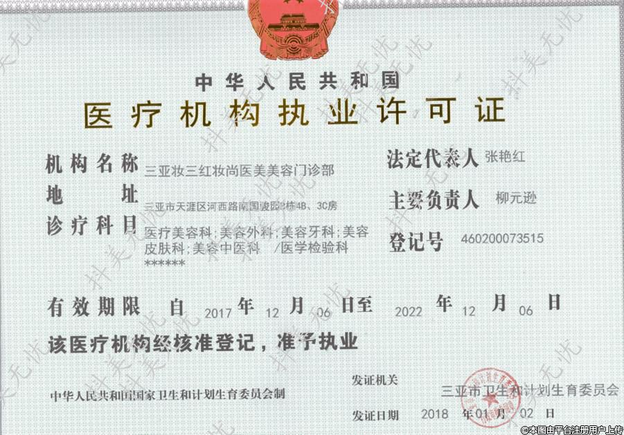機構(gòu)名稱:三亞妝三紅妝尚醫(yī)療美容門診部