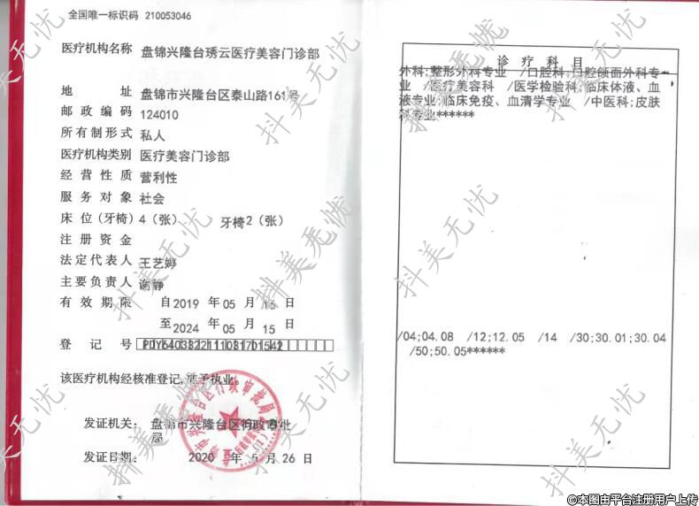 醫(yī)療機(jī)構(gòu)名稱(chēng):盤(pán)錦興隆臺(tái)琇云醫(yī)療美容門(mén)診部