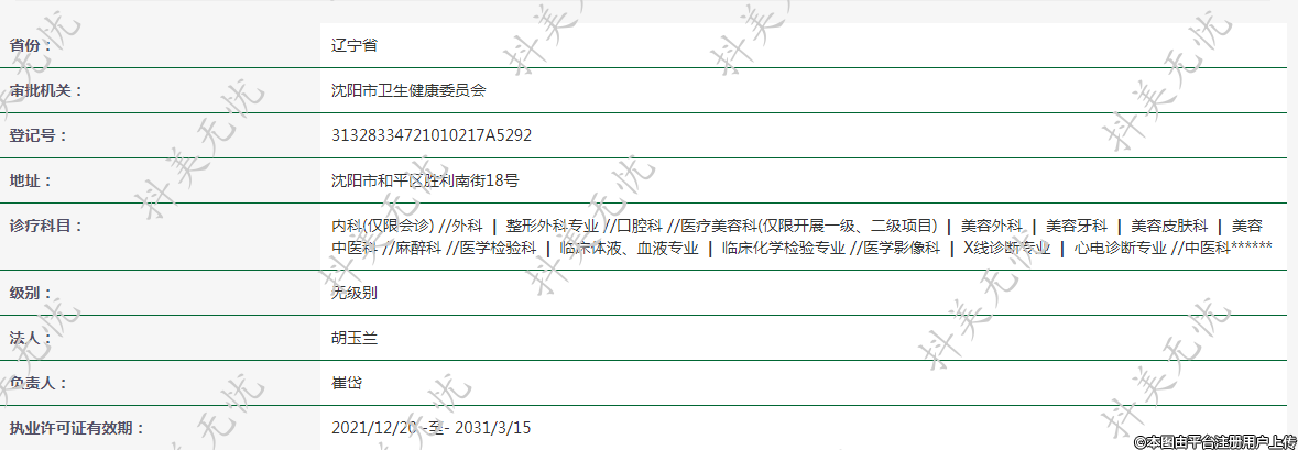 診療科目: 內(nèi)科(僅限會診) //外科 | 整形外科專業(yè) //口腔科 //醫(yī)療美容科(僅限開展一級、二級項目) | 美容外科 | 美容牙科 | 美容皮膚科 | 美容中醫(yī)科 //麻醉科 //醫(yī)學檢驗科 | 臨床體液、血液專業(yè) | 臨床化學檢驗專業(yè) //醫(yī)學影像科 | X線診斷專業(yè) | 心電診斷專業(yè) //中醫(yī)科******