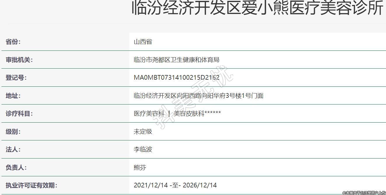 臨汾愛小熊醫(yī)療美容成立于2021-08-03,地址:臨汾經(jīng)濟開發(fā)區(qū)向陽西路向陽華府3號樓1號門面,診療科目:醫(yī)療美容科 | 美容皮膚科******