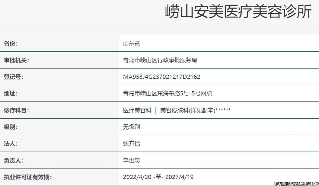 青島安美醫(yī)療美容,成立于2021-10-14,地址為山東省青島市l(wèi)嶗山區(qū)東海東路5號5號網(wǎng)點(diǎn),診療科目:醫(yī)療美容科 | 美容皮膚科******