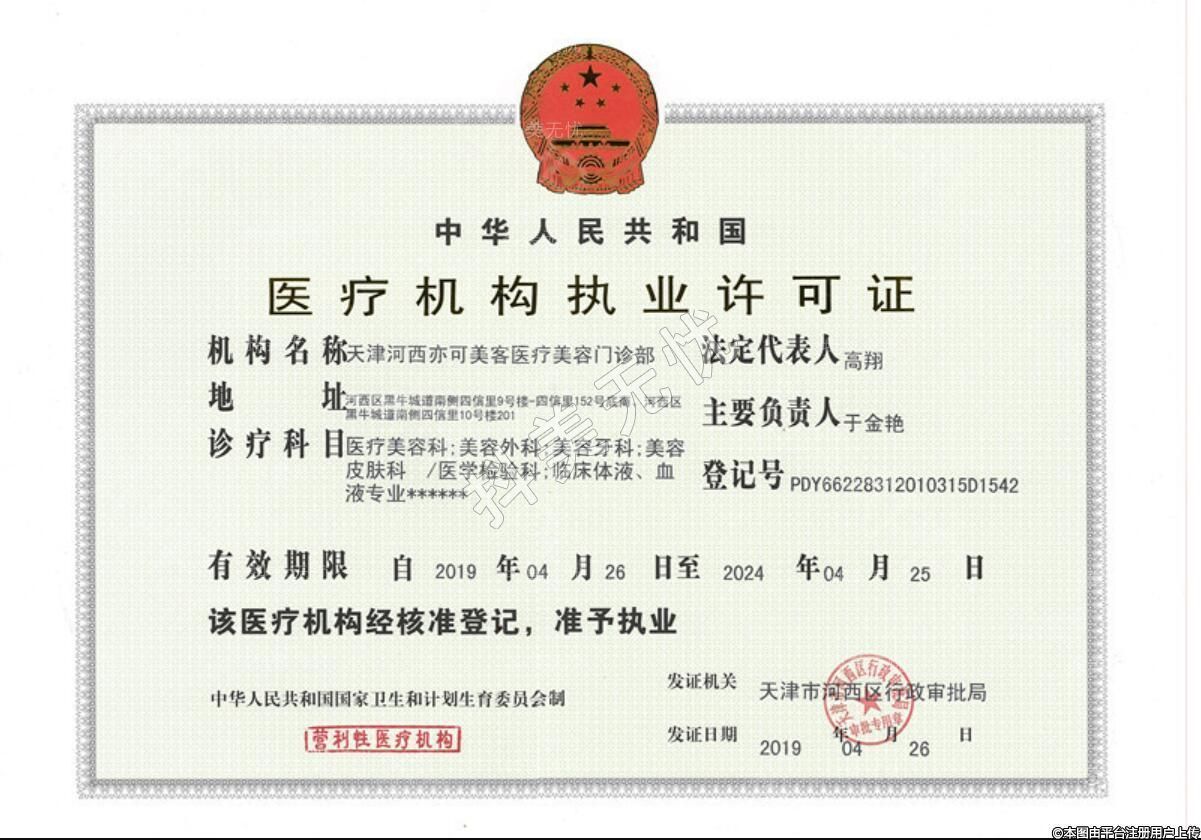 機構(gòu)名稱:天津河西亦可美客醫(yī)療美容門診部
