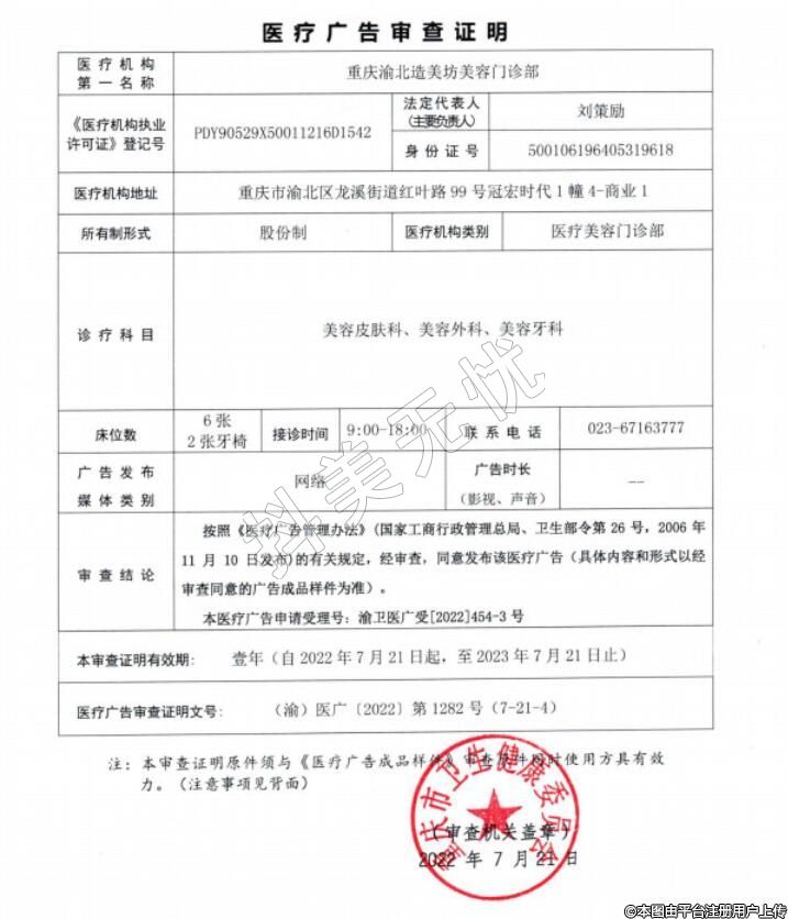 重慶造美坊美容地址:重慶市渝北區(qū)龍溪街道紅葉路99號冠宏時代1幢4-商業(yè)1,診療科目:美容外科 | 美容牙科 | 美容皮膚科(輸液)******