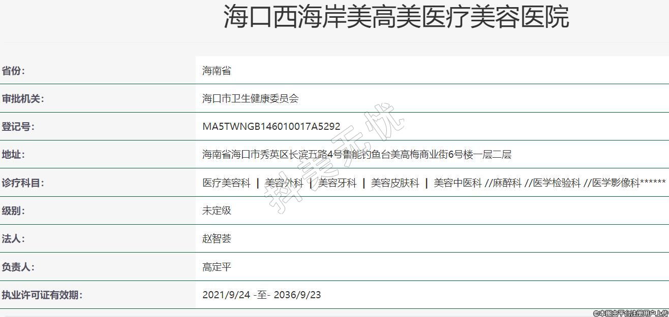 ??谖骱0睹栏呙泪t(yī)療美容2021-03-12成立,??谑行阌^(qū)長濱五路4號魯能釣魚臺美高梅商業(yè)街6號樓一層二層,診療科目:醫(yī)療美容科 | 美容外科 | 美容牙科 | 美容皮膚科 | 美容中醫(yī)科 //麻醉科 //醫(yī)學(xué)檢驗科 //醫(yī)學(xué)影像科******