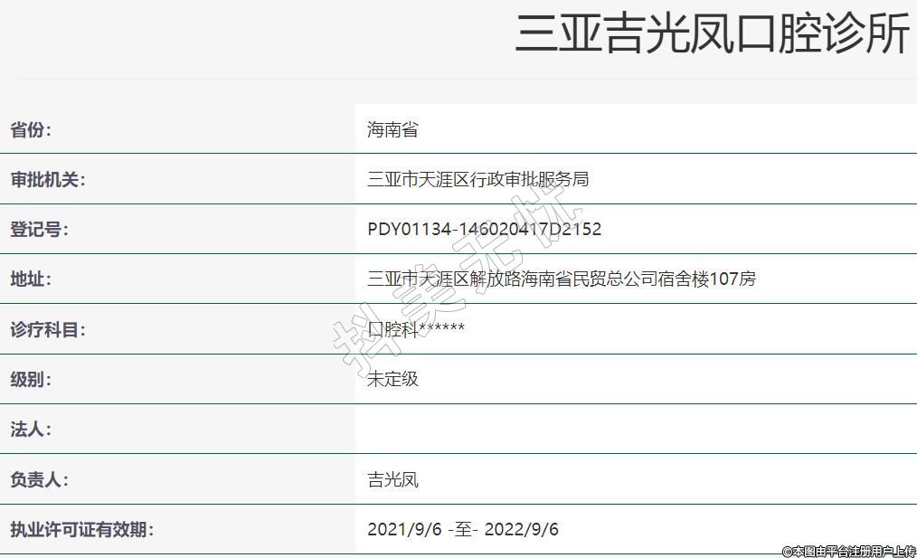 三亞吉光鳳口腔診所成立于2016-03-24,位于海南省三亞市天涯區(qū)解放路海南省民貿(mào)總公司宿舍樓107房??剖曳秶锌谇豢?。