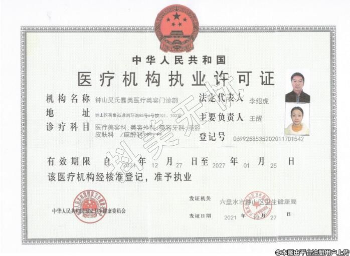 六盤水吳氏嘉美醫(yī)療美容2021-06-28成立,地址:鐘山區(qū)荷泉街道南環(huán)路85號(hào)6號(hào)樓101、103室,診療科目:醫(yī)療美容科 | 美容外科 | 美容牙科 | 美容皮膚科 //麻醉科******