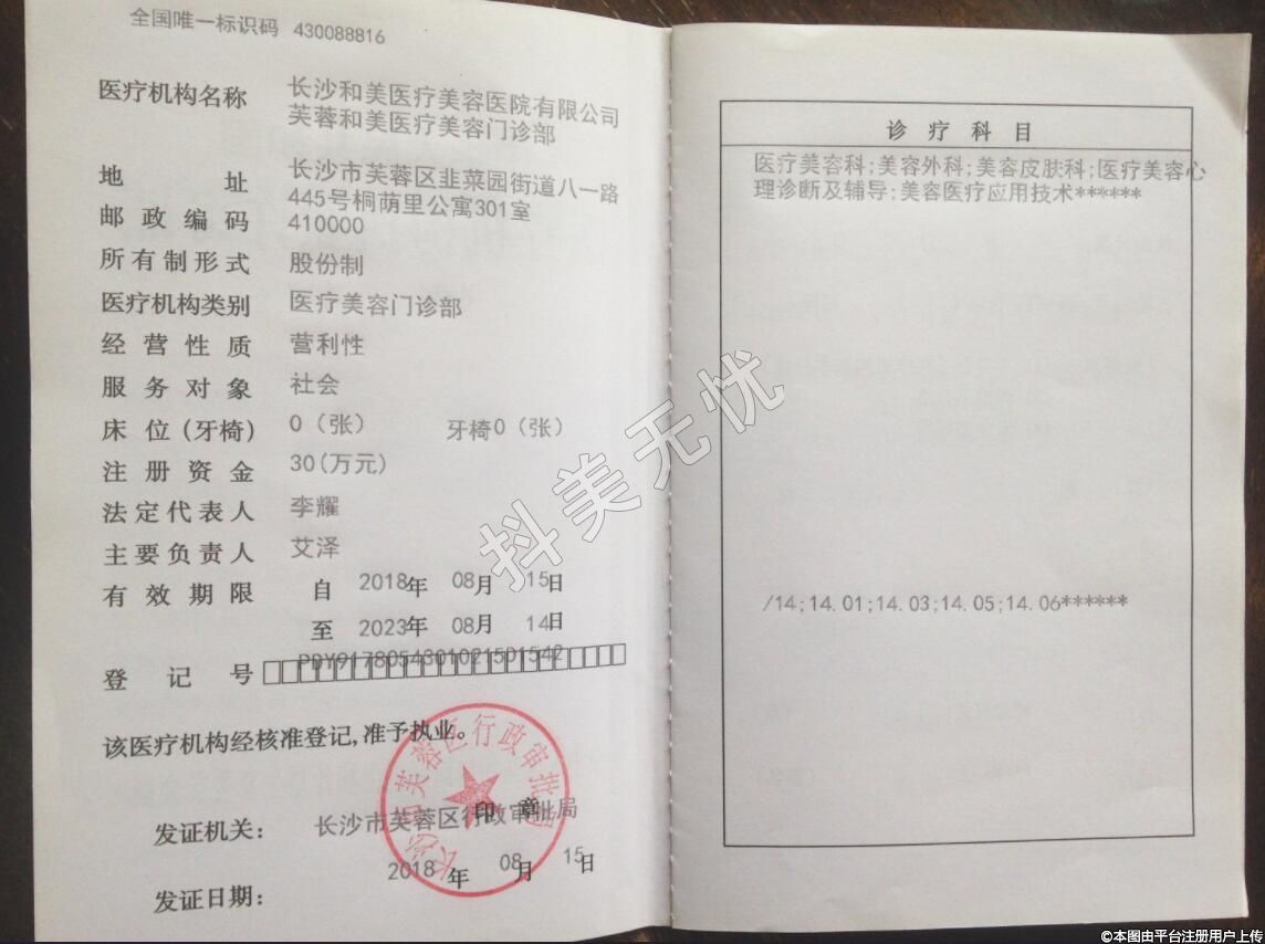 醫(yī)療機(jī)構(gòu)名稱:長沙和美醫(yī)療美容醫(yī)院有限公司芙蓉和美醫(yī)療美容門診部