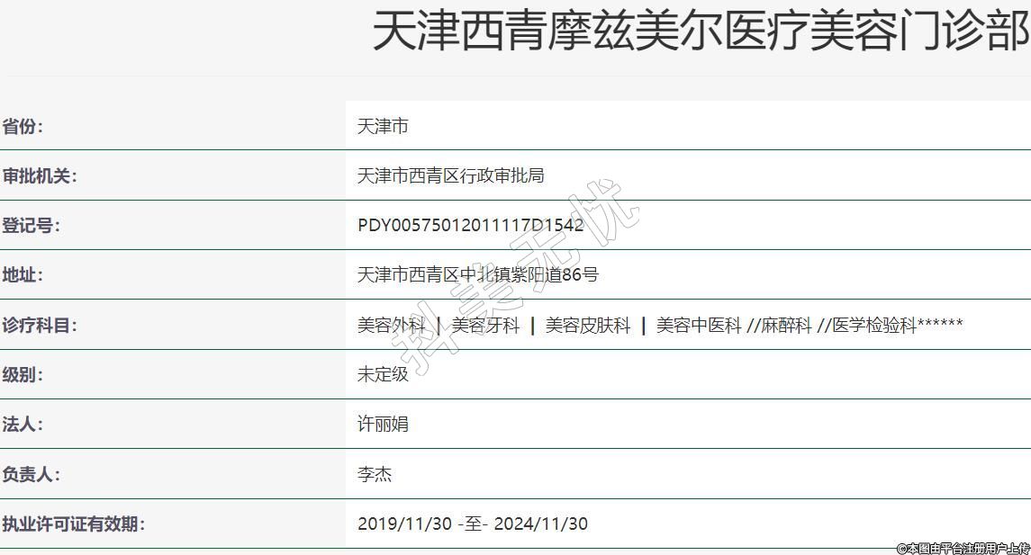 天津摩茲美爾醫(yī)療美容2017年03月09日,地址:天津市西青區(qū)中北鎮(zhèn)紫陽道86號,診療科目:美容外科 | 美容牙科 | 美容皮膚科 | 美容中醫(yī)科 //麻醉科 //醫(yī)學(xué)檢驗科******