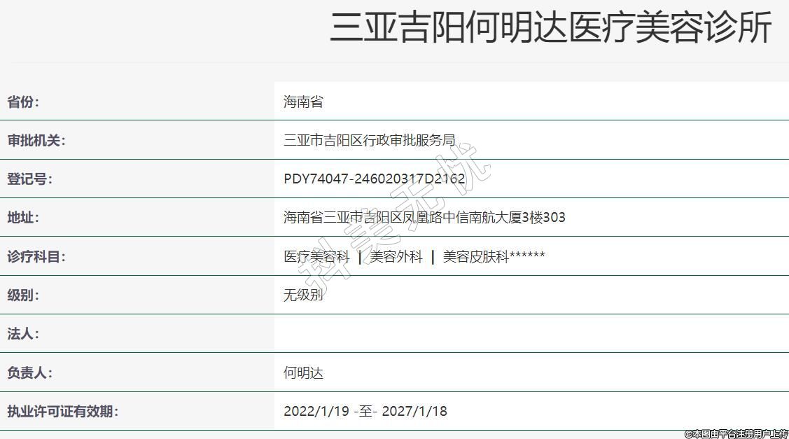 三亞何明達(dá)醫(yī)療美容2022-03-16成立,地址:海南省三亞市吉陽區(qū)鳳凰路中信南航大廈3樓303,診療科目:醫(yī)療美容科 | 美容外科 | 美容皮膚科******