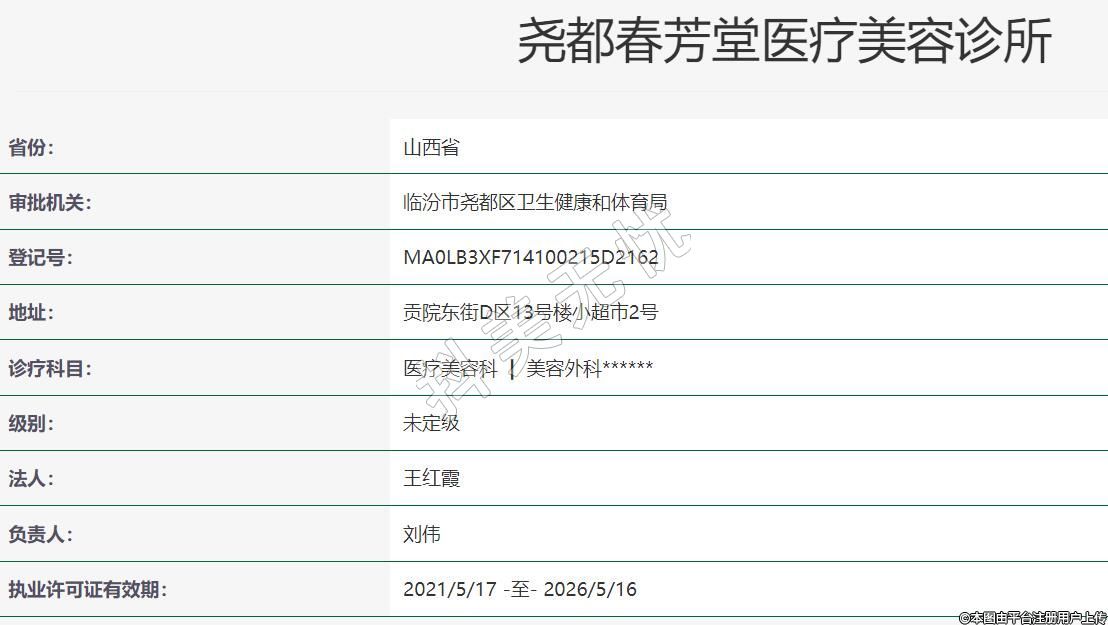 臨汾春芳堂醫(yī)療美容2020年10月21日成立,地址:貢院東街D區(qū)13號樓小超市2號,診療科目:醫(yī)療美容科 | 美容外科******