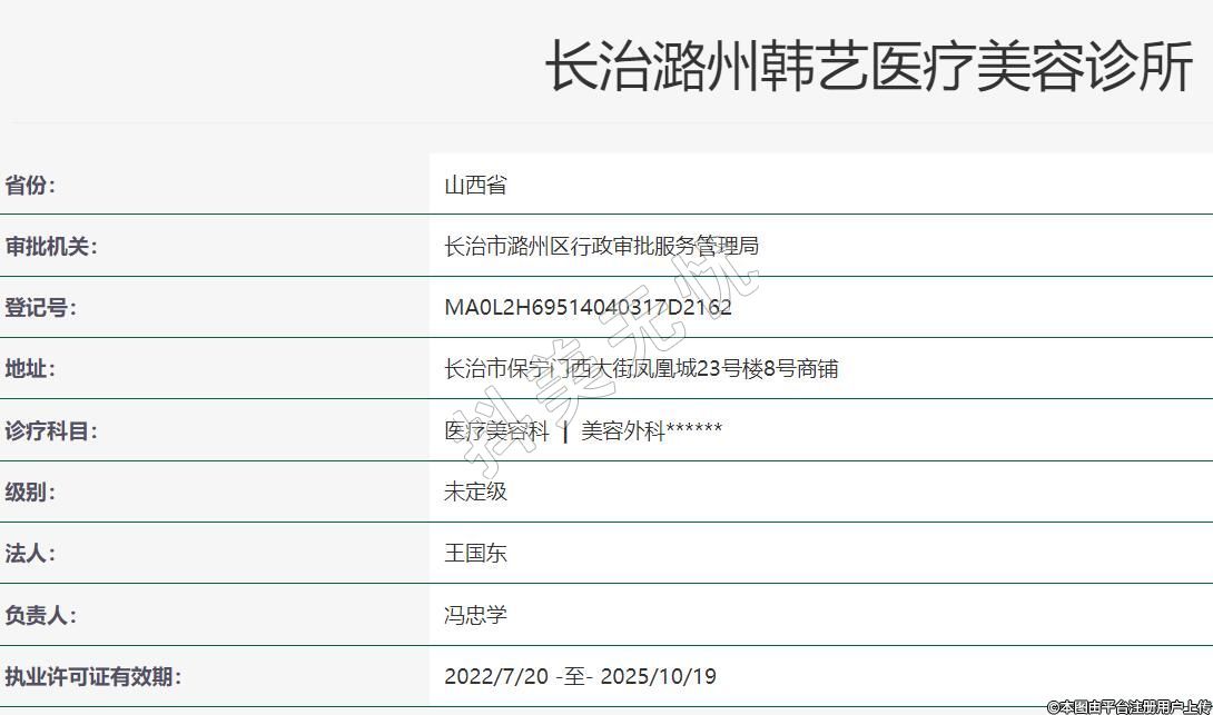 長治韓藝醫(yī)療美容2020年05月09日成立,地址:長治市保寧門西大街鳳凰城23號(hào)樓8號(hào)商鋪,診療科目:醫(yī)療美容科 | 美容外科******